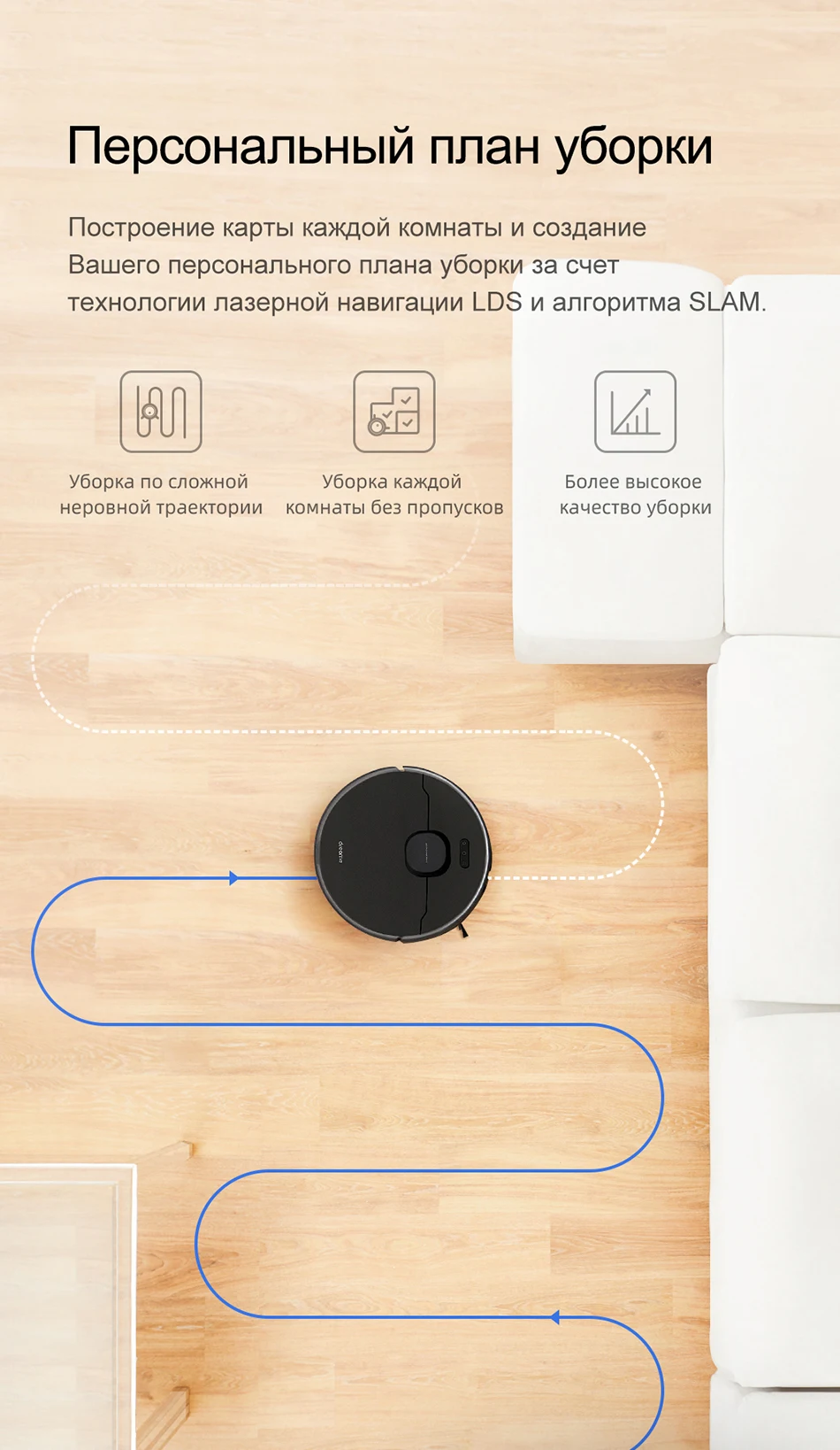 Настраивает вашу уборку с помощью сопоставления комнат с помощью LDS навигации и алгоритма SLAM.